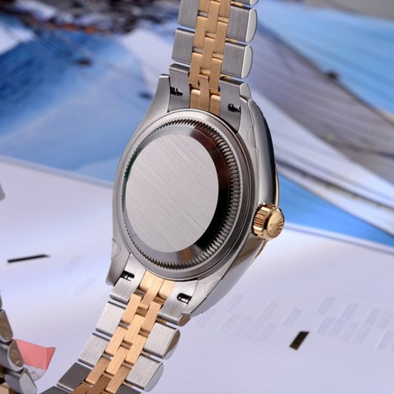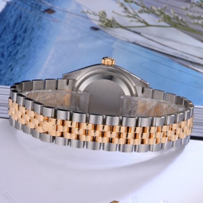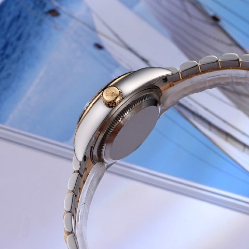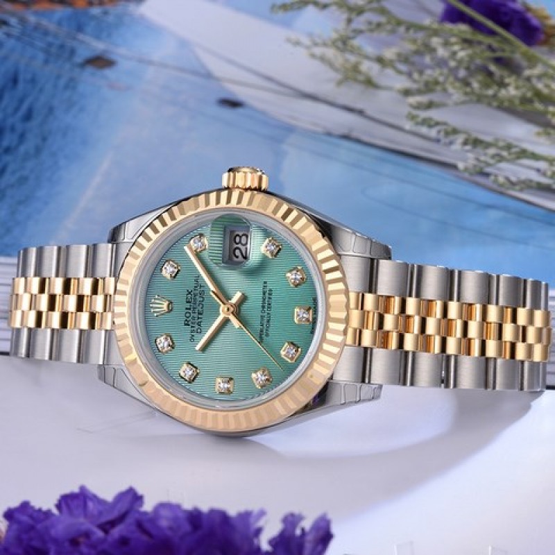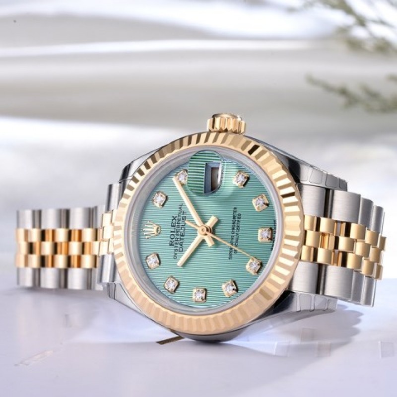 Reloj mecánico automático Rolex Datejust para dama, serie 279173-63343, con barra verde y 10 diamantes.